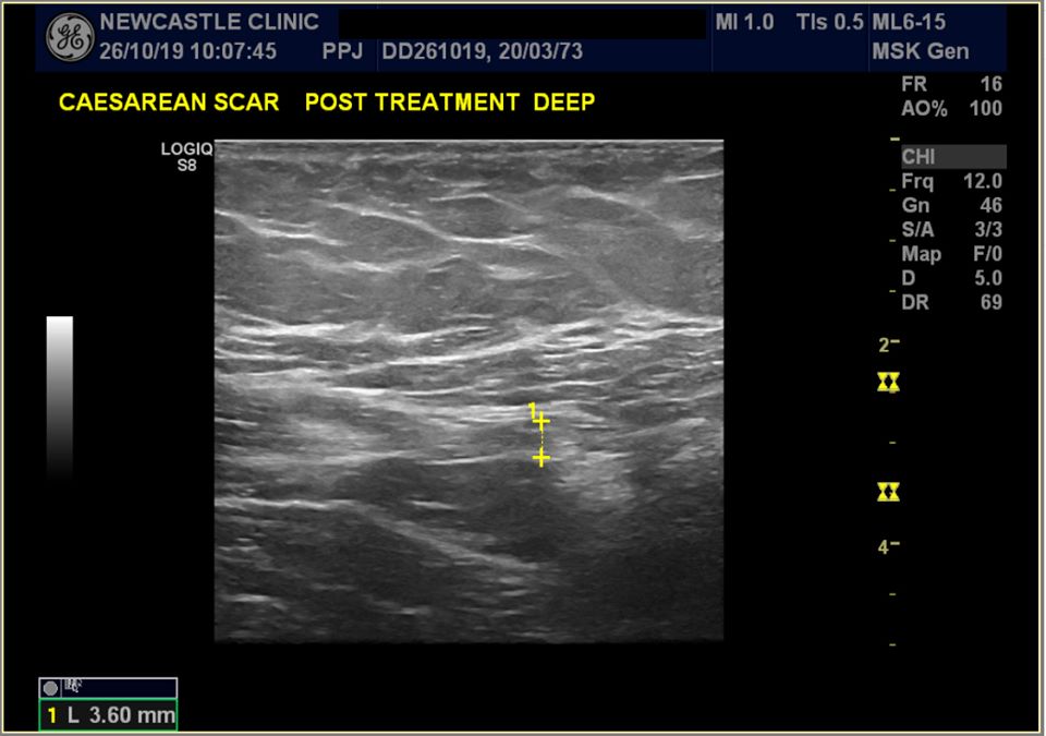 Direkt efter behandlingen skannade man åter igen med ultraljud och mätte ärrets storlek och djup.