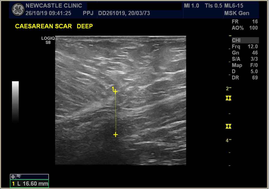 2019 genomfördes, med hjälp av ultraljudsmätning, en studie på kejsarsnittsärr. 12 kvinnor ingick i studien.